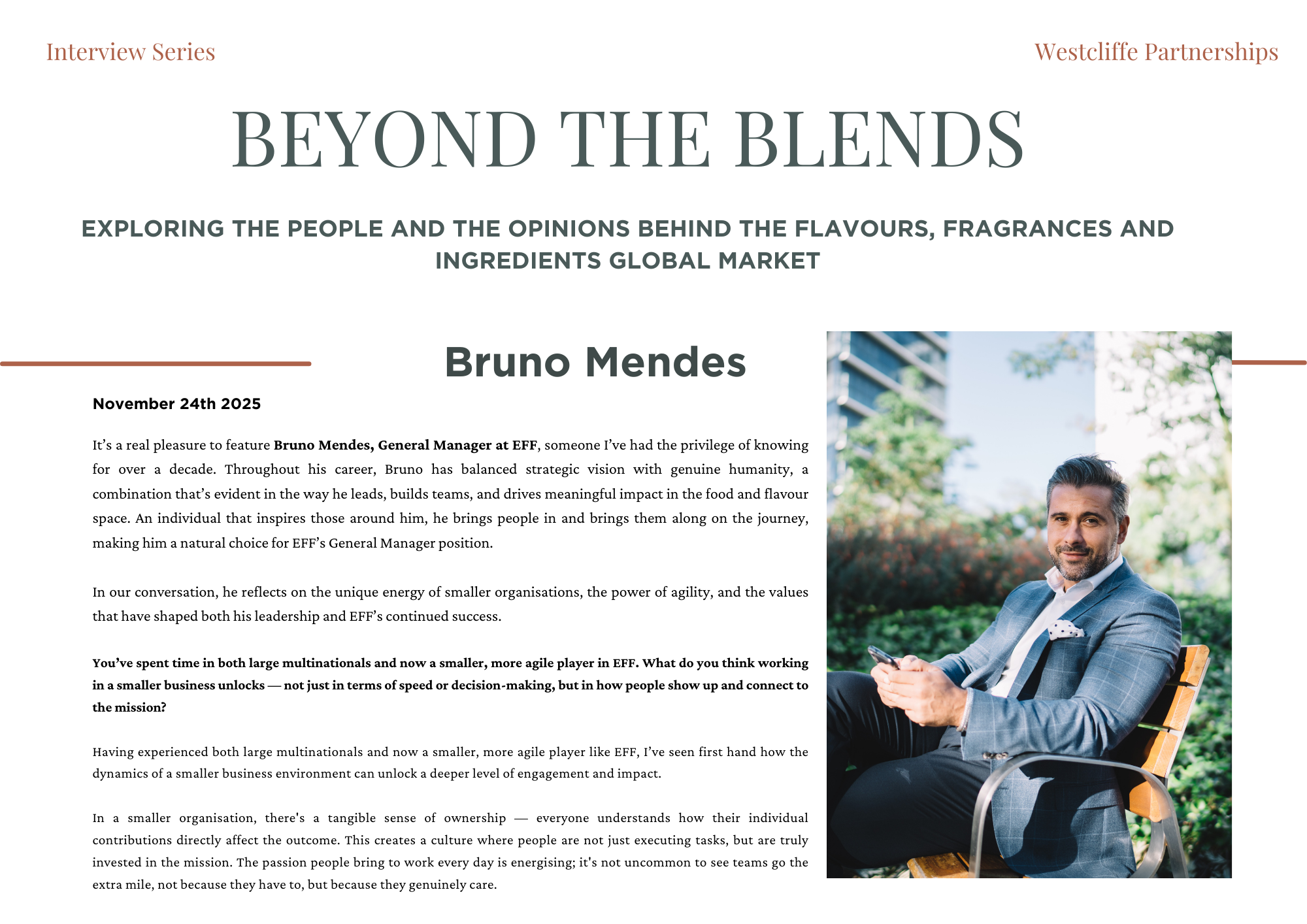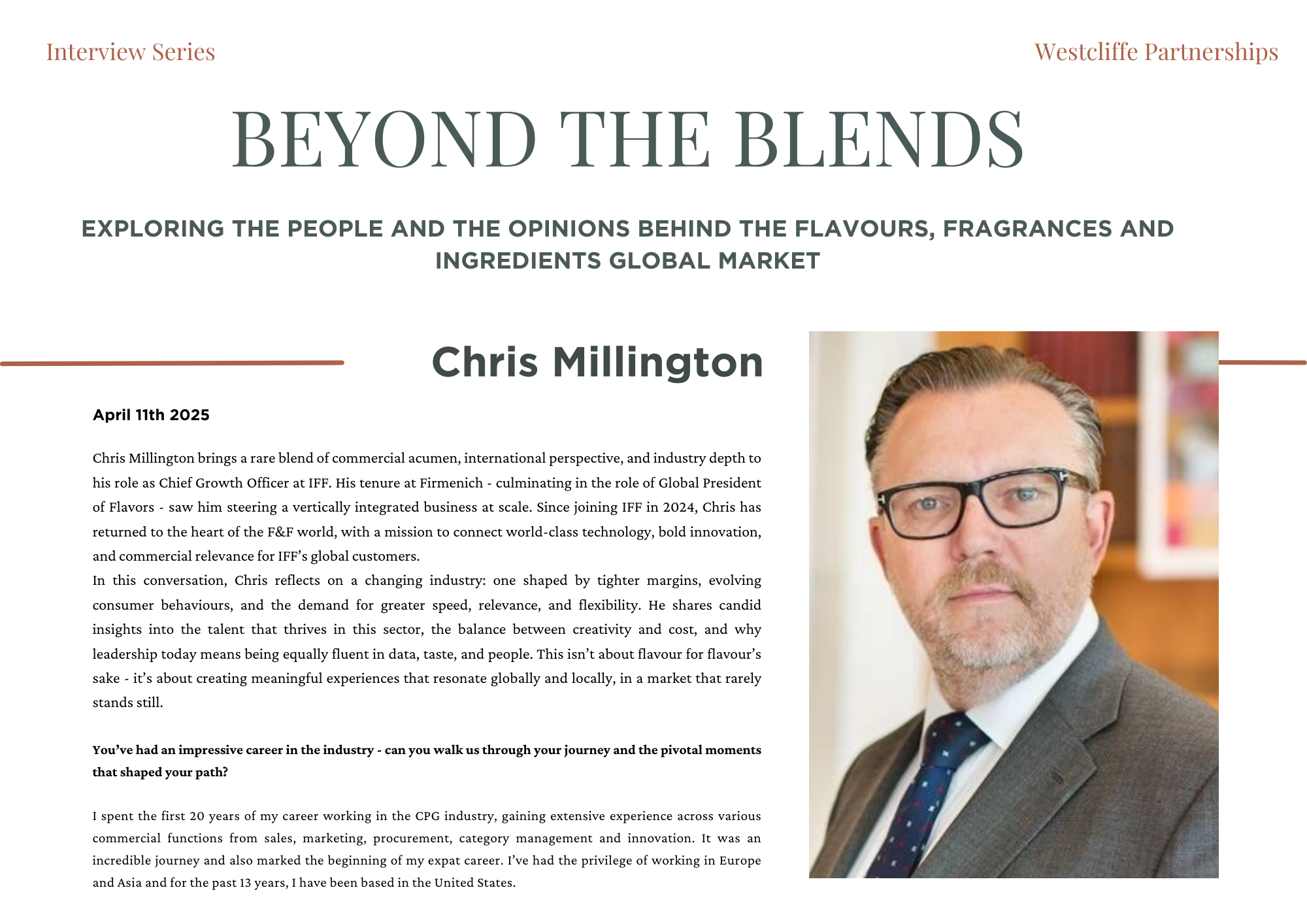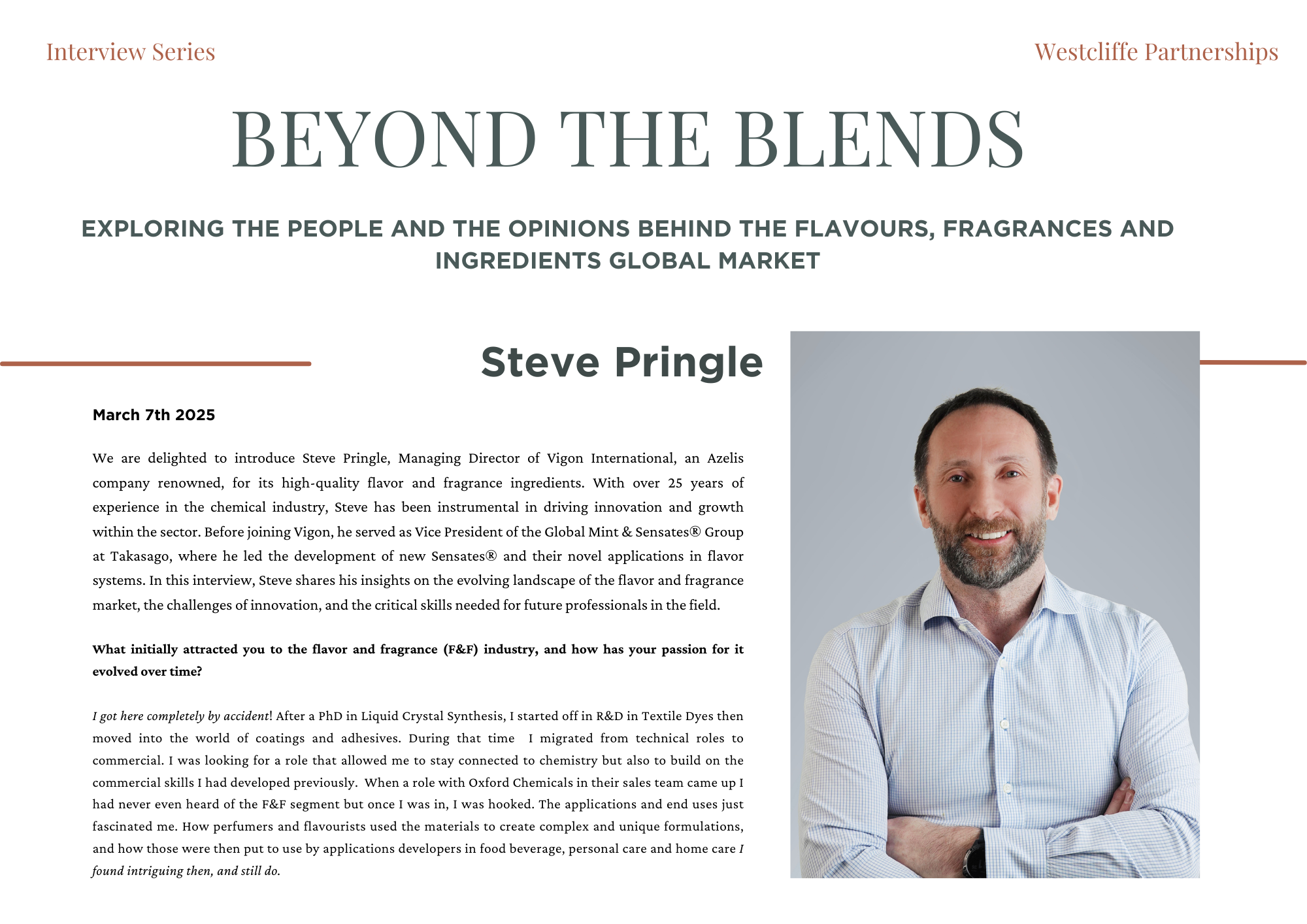 Beyond the Blends is an exclusive editorial series created by Westcliffe Partnerships, shining a light on the people shaping the future of flavours, fragrances, and functional ingredients. Each feature explores the human side of innovation - uncovering personal philosophies, leadership journeys, and the industry’s most pressing questions. Less PR spin, more perspective. From commercial leaders to technical pioneers, we speak to those at the heart of the sector to explore what’s driving change and what’s coming next.