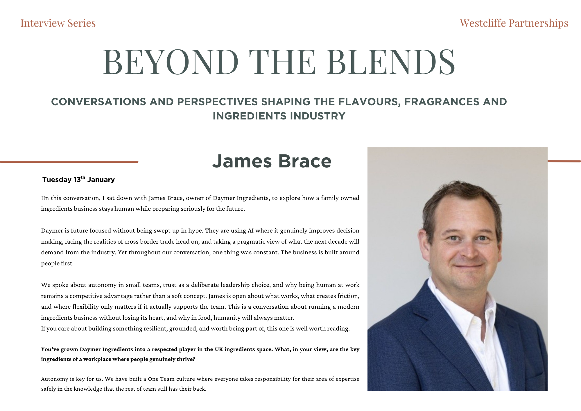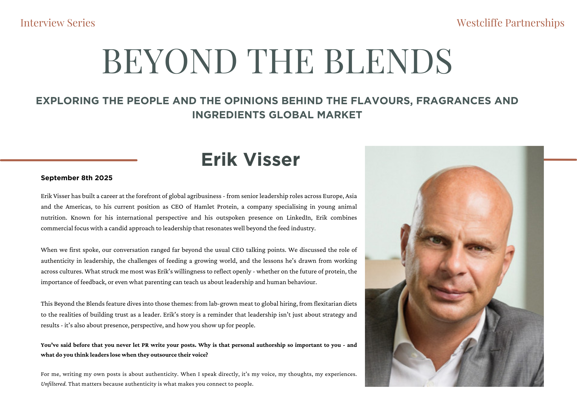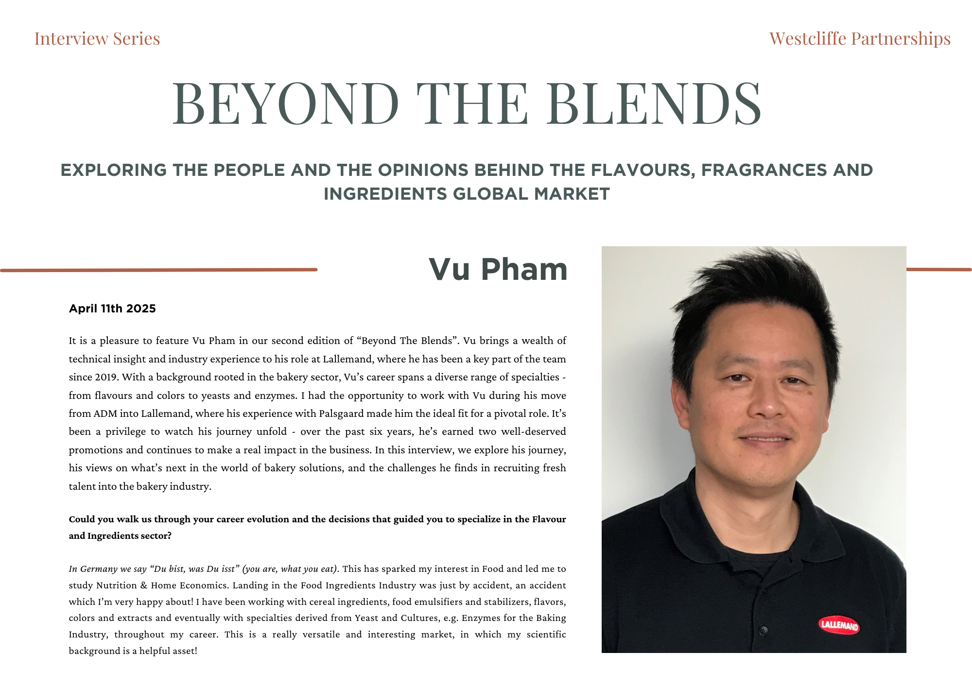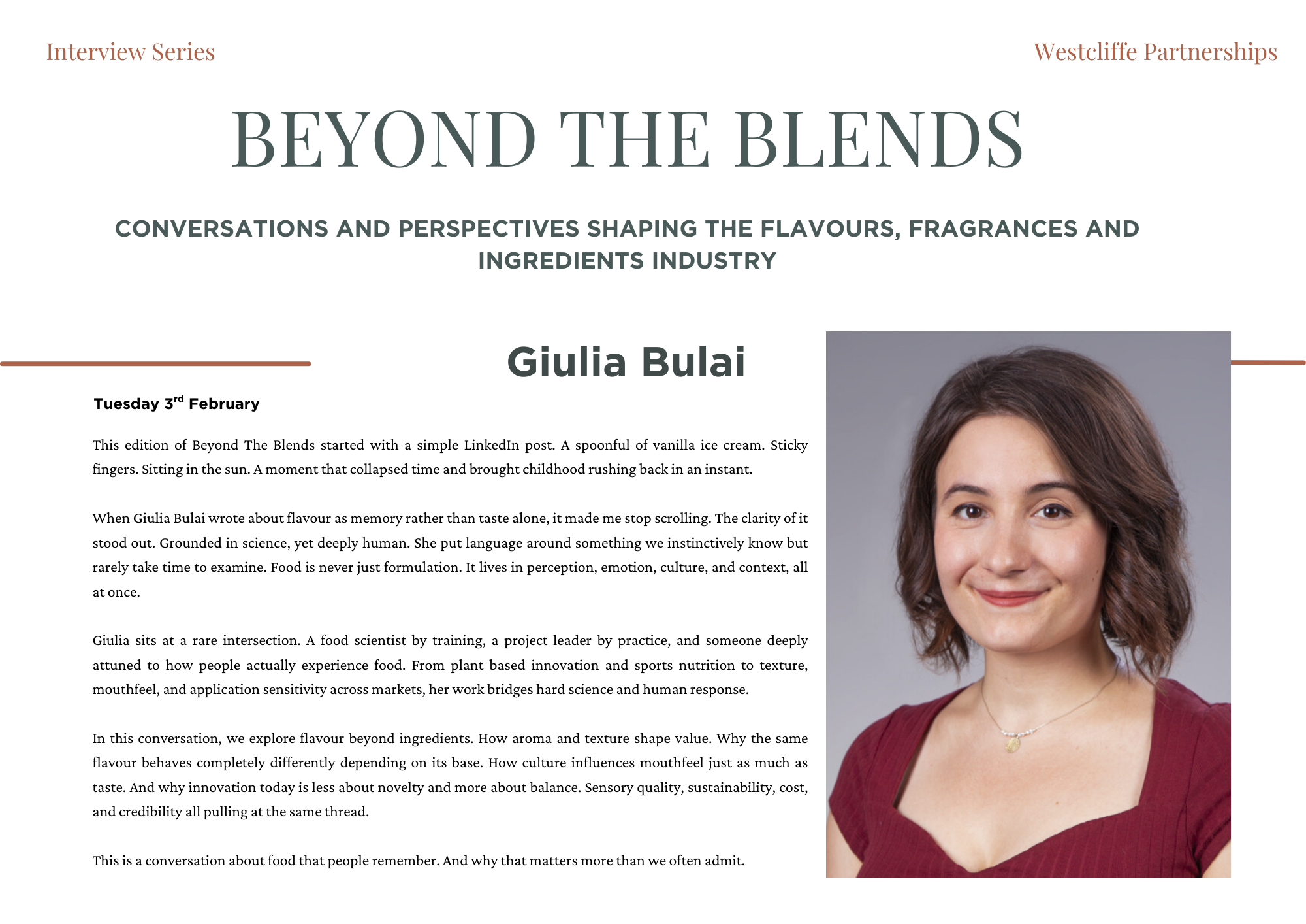 Beyond the Blends is an exclusive editorial series created by Westcliffe Partnerships, shining a light on the people shaping the future of flavours, fragrances, and functional ingredients. Each feature explores the human side of innovation - uncovering personal philosophies, leadership journeys, and the industry’s most pressing questions. Less PR spin, more perspective. From commercial leaders to technical pioneers, we speak to those at the heart of the sector to explore what’s driving change and what’s coming next.